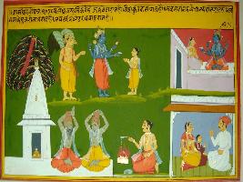 | Description / विवरण | Miniature painting based on Kashi khand. On the upper part Vishnu and Garuda with a priest are depicted. On the lower part two sages doing penance in front of a temple and one man performing yagna is depicted along with a family. |