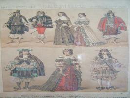| Description / विवरण | France, 17th century. Gentlemen in the Marshall Gugbriant. Rage of the same household. The fashion of wearing a long hair was very popular with men throughout 17th century. Rich women wearing heavy worked gowns. The picture is divided into two panels. |