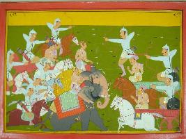 | Description / विवरण | Miniature painting based on Mahabharat - Ashwamegh parva depicting war scene between two army who are riding on horseback, elephants and chariots. |