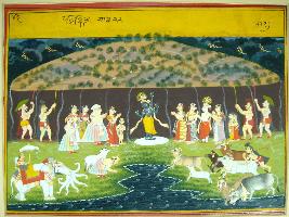 | Description / विवरण | Miniature painting based on Krishna avatar charit depicting the seen of Govardhan lifting and all the gopa and gopis and animal resting under the Govardhan mountain while Indra is seen praying to Krishna along with his vehicle. |