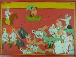 | Description / विवरण | Miniature painting based on Mahabharat - Ashwamegh parva depicting war scenes, warrior on chariot shown shooting arrows on opposition army. Some soldiers are shown fleeing from the battle field. At the middle top part. Gandharvas with apsaras are seen sitting in their vahan. |