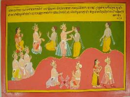 | Description / विवरण | Miniature painting based on Mahabharat - Vana parva. On the upper part a king is depicted making tilak to a king who came in the guise of a sage. On the lower part two kings are depicted playing chaupar, one is raja Nal, depicted in game Raja Nal was depicted going to forest with his wife. |