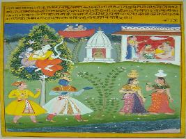 | Description / विवरण | Miniature painting based on Rasikpriya depicting Krishna followed by one of his friends in the bank of the river Yamuna where they meet Radha and her friend, while Kamdev and Rati devi are watching them from a tree. On the upper part of the painting a couple is sitting in the palatial balcony with a female chauri bearer. |