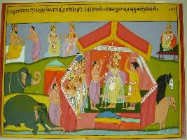 | Description / विवरण | Miniature painting based on Raghuvansha depicting elephant at middle right part. At the top left, king is shown depicted on couch. At the top right, sage talking to a Brahman. At the centre, king is shown with courtiers in a tent and Brahman is showering flowers on the king. |