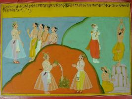| Description / विवरण | Miniature painting based on Mahabharat - Adi parva depicting that Raja is performing some yagna, he pours water into the yagna and lord Agni appears in front of him and give him blessings. A saint on right hand side is performing a penance, Shiv appears in front of him and asks him to break his fast. |