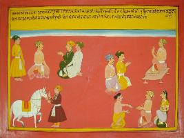 | Description / विवरण | Miniature painting based on Mahabharat - Vana parva depicting that there is a king Mala. He got all the knowledge of arms, weapons and Vedas. There is an another king Bhim of Vidarbha state. He served sage Tiradaman and got the blessing of 3 son and one daughter. |