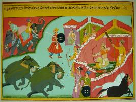 | Description / विवरण | Miniature painting based on Raghuvansha depicting a king shooting arrows on the elephants from his tent. On right top corner two elephants with Mahavat are depicted. On left-below corner two horses are shown. |