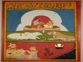 | Description / विवरण | Miniature painting based on Sarangadhar depicting Shiv seated with Parvati on Kailash with their vahanas- tiger and Nandi. A king talking to his son at the lower part. |