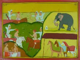 | Description / विवरण | Miniature painting based on Mahabharat - Ashwamegh parva depicting two men are fighting with bows and arrows at upper right part in two panel. At the left part, an elephant and horses are depicted tied in stable. At the lower right part, king is seen taking to sages. |