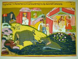 | Description / विवरण | Miniature painting based on Raghuvansha depicting a elephant struggling to come out from a river. On top middle kings with companions have been shown in the tents. |