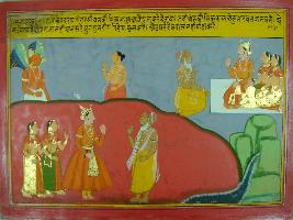 | Description / विवरण | Miniature painting based on Mahabharat - Sabha parva depicting Brihadrath come to Chand kaushik sage with his son, sage told them that his son will became very powerful and will be famous for years. |