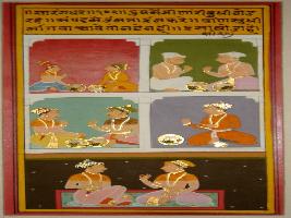 | Description / विवरण | Miniature painting based on Sarangadhar depicting four scenes in four panels- at the top right panel two boys are eating. In the 2nd panel on left two old men are eating. At the lower right panel two middle aged men are eating, while at the left side a young man is eating. Two men are seating and talking at the lower part of the painting. |