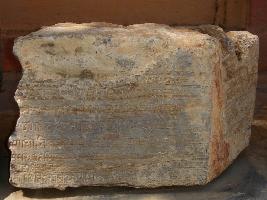 | Description / विवरण | A block of stone with epigraph having 8 lines in Devnagri script describing about the construction of Chittorgarh fort. The first two lines is completely rubbed off and unable to read. |