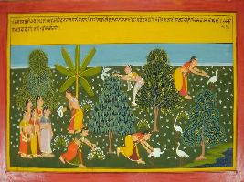 | Description / विवरण | Miniature painting based on Mahabharat - Vana parva depicting that Damanyanti, princes of Vidarva kingdom loitering in the garden when a swan come to the garden, then Damyanti run after the swamn to catch it. |