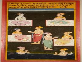 | Description / विवरण | Miniature painting based on Sarangadhar depicting Shiv seated on mat, besides him a man is seated, below two men are offered drink in bowls by two standing men. Two men are taking bath in the river. |