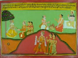 | Description / विवरण | Miniature painting based on Mahabharat - Sabha parva depicting Brihadrath with his two wives going to meet sage Kahnadakaushik and serve him. The sage got satisfied and ask him to seek boon. Then king says that he want a son, then sage gave hjim a mango to feed his queens. |