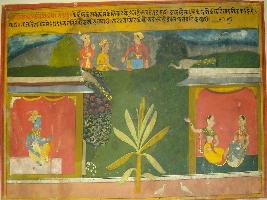 | Description / विवरण | Miniature painting based on Rasikpriya depicting Radhika s Prasang . Krishna is sitting far from Radha and Radha is sitting with her friend. In the upper part, musicians are depicted narrating the story. |