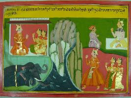 | Description / विवरण | Miniature painting based on Mahabharat - Sabha parva depicting Brihadrath marrying with two princess of Kashi. He travelled with them, visited junture of Yamuna and Ganga where elephants are taking bath. |