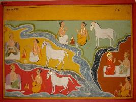 | Description / विवरण | Miniature painting based on Mahabharat - Ashwamegh parva depicting about how Ashwamegh yagna is performed. The Brahmans are performing yagna for king. |