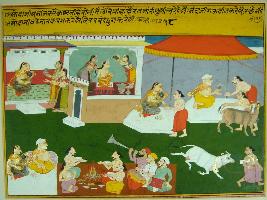| Description / विवरण | Miniature painting based on Krishna avatar charit depicting, Yashoda taking a bath at the top right to its left. Yashoda with Krishna on lap giving aim to Brahman and Nand ji giving low to Brahman. At the lower portion, Yashoda with Krishna on his lap and Nand ji performing a yagna with some musician. |