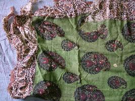 | Description / विवरण | This almost damaged rectangular quilt is very nicely printed by creepers in yellow and black colours and its border is of white colours. Its lower cloth is printed by mango leaves of black and red colours on green ground. |