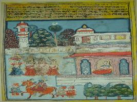 | Description / विवरण | Miniature painting based on Baramasa depicting the Chaitra month. The painting depicting Krishna moving out of his palace and four females are going together one of which carrying a statue of a goddess. At the background in the garden flowers are blooming and nightingale bird is singing. |
