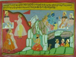 | Description / विवरण | Miniature painting based on Mahabharat - Sabha parva depicting Yudhisthir telling Bhim that he got Arjun eyes and Krishna s mind. Arjun asked them to change into cloths of Brahman and leave chariot. He stopped darsandha on his way. |