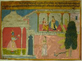 | Description / विवरण | Miniature painting based on Rasikpriya depicting Krishna standing with a lotus flower in his hands and waiting for Radha in the right part. Radha is seen sitting with a friend in the top left part. |