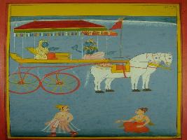 | Description / विवरण | Miniature painting based on Shri Bhagwat Gita. It depicts Krishna preaching Arjun in the lower part of the painting it depicts king is moving and one Brahman is sitting. |