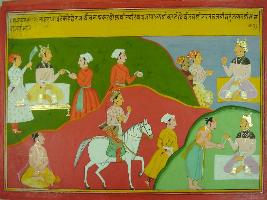 | Description / विवरण | Miniature painting based on Mahabharat - Sabha parva depicting Bhim telling king Yudhisthir about king Jaubanashwa, king Bhagirath, Kartyavirya, Marut, Bharat etc who get their kingdoms due to performing of dharma. |