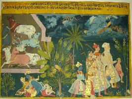 | Description / विवरण | Miniature painting based on Rasikpriya depicting many seated cows at the right side, below it Krishna and Radha in loving union. Due to rainfall, everyone-Radha, Krishna, Nand, gopas and gopis are heading back home. |