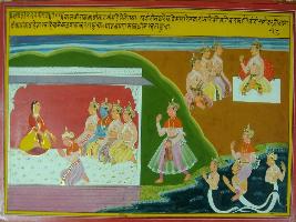 | Description / विवरण | Miniature painting based on Mahabharat - Adi parva depicting Pandavas with Kunti. Bhim comes to greet Kunti. Another side on top Duryodhan is conspiring with friend, how to kill Pandavas. |