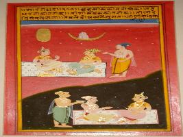 | Description / विवरण | Miniature painting based on Sarangadhar depicting a king seated on mat, in front of him a man is seated and another one is standing, at the lower part a king is talking to a man and an attendant is standing with holding a bowl. |