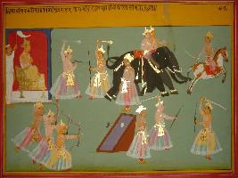 | Description / विवरण | Miniature painting based on Mahabharat - Adi parva depicting Dhritrashtra Pandu and Vidur getting lesson on using arms and weapons. |