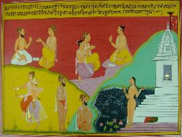 | Description / विवरण | Miniature painting based on Mahabharat - Adi parva depicting asking Vyas about the birth of Drona. Then Vyas says that sage Bhardwaj who lived in Haridwar, one day saw a nude apsara due to which he became lusty and apsara gave birth to Drona, after that Drona learnt archery from Aganivesh rishi. |