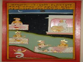 | Description / विवरण | Miniature painting based on Sarangadhar depicting a man seated on mat, in front of him a man is seated in the palace. Rahu and Ketu are shown above them. A king is seated with a young boy. A snake holding a crescent moon on its head is shown at the lower part. |