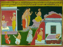 | Description / विवरण | Miniature painting based on Mahabharat - Adi parva depicting Dronacharya s marriage with Kripi. They gave birth to a son, his name was Ashwathama. |