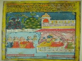 | Description / विवरण | Miniature painting based on Baramasa depicting Magh month. The painting depicting Krishna sitting with Radha on a couch and enjoying music. A female attendant is seen behind them. Part of garden and clear sky is seen at the background. |