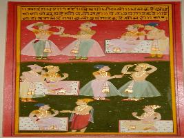 | Description / विवरण | Miniature painting based on Sarangadhar depicting scenes in which two men together are shown five times and a single man seated. Here they are talking about how much money can lead a person blind. |