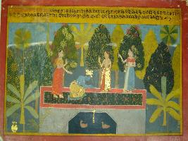 | Description / विवरण | Miniature painting based on Rasikpriya depicting Sri Radhika ji ki prem ke pranati . The painting depicts Krishna pledging his love before Radhika. One female chauri bearer is seen behind Radhika. One of her friend standing behind Krishna asks Radhika what is her answer to Krishna. Then Radhika replies that she honours Krishna. |