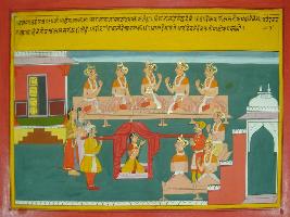 | Description / विवरण | Miniature painting based on Mahabharat - Vana parva depicting scene of Swayambar of Damayanti where Indra and gods took the form of Raja Nal. Damayanti is depicted praying the five gods disguised as Nal to show their real form. |