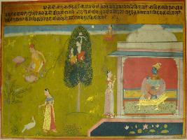 | Description / विवरण | Miniature painting based on Rasikpriya depicting a carpenter on the right upper corner, below it Nayika playing with a peacock, while on the left of the painting Krishna is seated in a palace and talking to a female messenger. Kamdev and Rati are sitting on a tree in the centre. |
