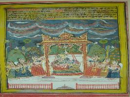 | Description / विवरण | Miniature painting based on Baramasa depicting the month Shravan in which Krishna with Radha sitting in a swing. Six Gopis are seen with them. Clouds are seen in the sky and birds are singing. |