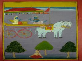 | Description / विवरण | Miniature painting based on Shri Bhagwat Gita. It depicts Krishna preaching Arjun, in the lower part of the painting it depicting one Brahman is meditating in the forest. |