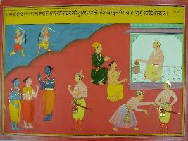 | Description / विवरण | Miniature painting based on Mahabharat - Sabha parva. It deipcts Jarasandha is coming to Bhim and Arjun for fight. |