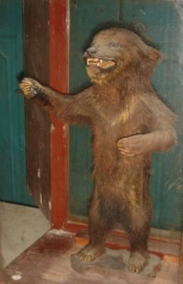 | Description / विवरण | Specimen of bear cub with open mouth, standing on a wooden pedestal. It is preserved with taxidermy system. |