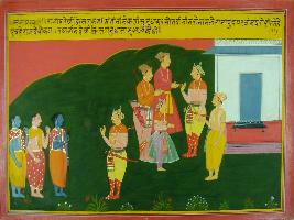 | Description / विवरण | Miniature painting based on Mahabharat - Sabha parva depicting Krishna saying that when a king become old he should hand over the kingdom to his son and go to jungle. |