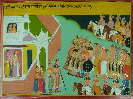 | Description / विवरण | Miniature painting based on Mahabharat - Adi parva. Pandavas are depicted coming to Panchal country to take Draupadi and the king is depicted standing on the gate to receive them. |