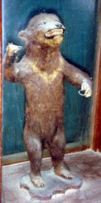 | Description / विवरण | Specimen of bear cub with open mouth, standing on a wooden pedestal. It is preserved with taxidermy system. |