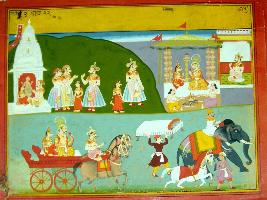 | Description / विवरण | Miniature painting based on Krishna avatar charit depicting scenes of marriage ceremony of Devki and Vasudev. In the lower part Devki and Vasudev is seen on a chariot pulled by two horse and followed by peoples. |